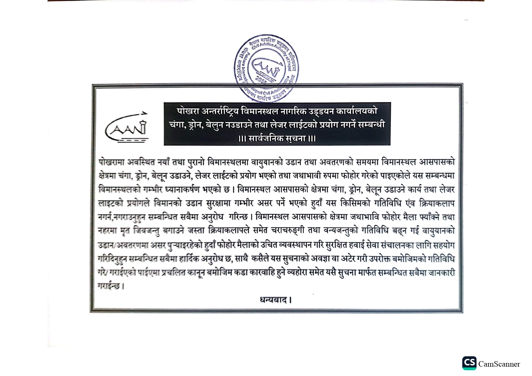 Public Notice Regarding Kites, Drone, Balloon as well as Laser light !!!
